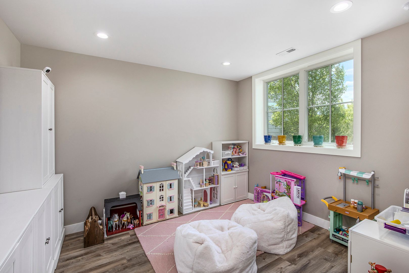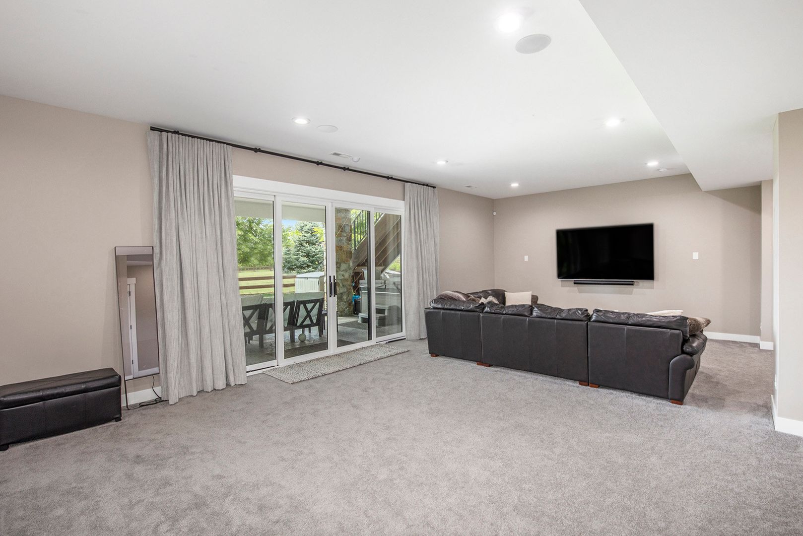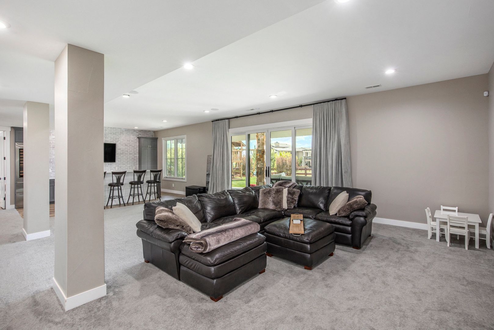 The gourmet kitchen features a large quartz island, farmhouse sink, custom hood, double ovens, and high-end appliances—perfect for both everyday living and entertaining. The spacious great room includes a modern linear fireplace and opens to a covered patio with a built-in grill and outdoor fireplace. The primary suite is a serene retreat with a spa-like bath, soaking tub, and walk-in shower. Additional highlights include 4 bedrooms, 3.5 bathrooms, a dedicated home office, fully finished basement with wet bar and wine fridge, basement bonus/play room, and multiple outdoor living areas.
